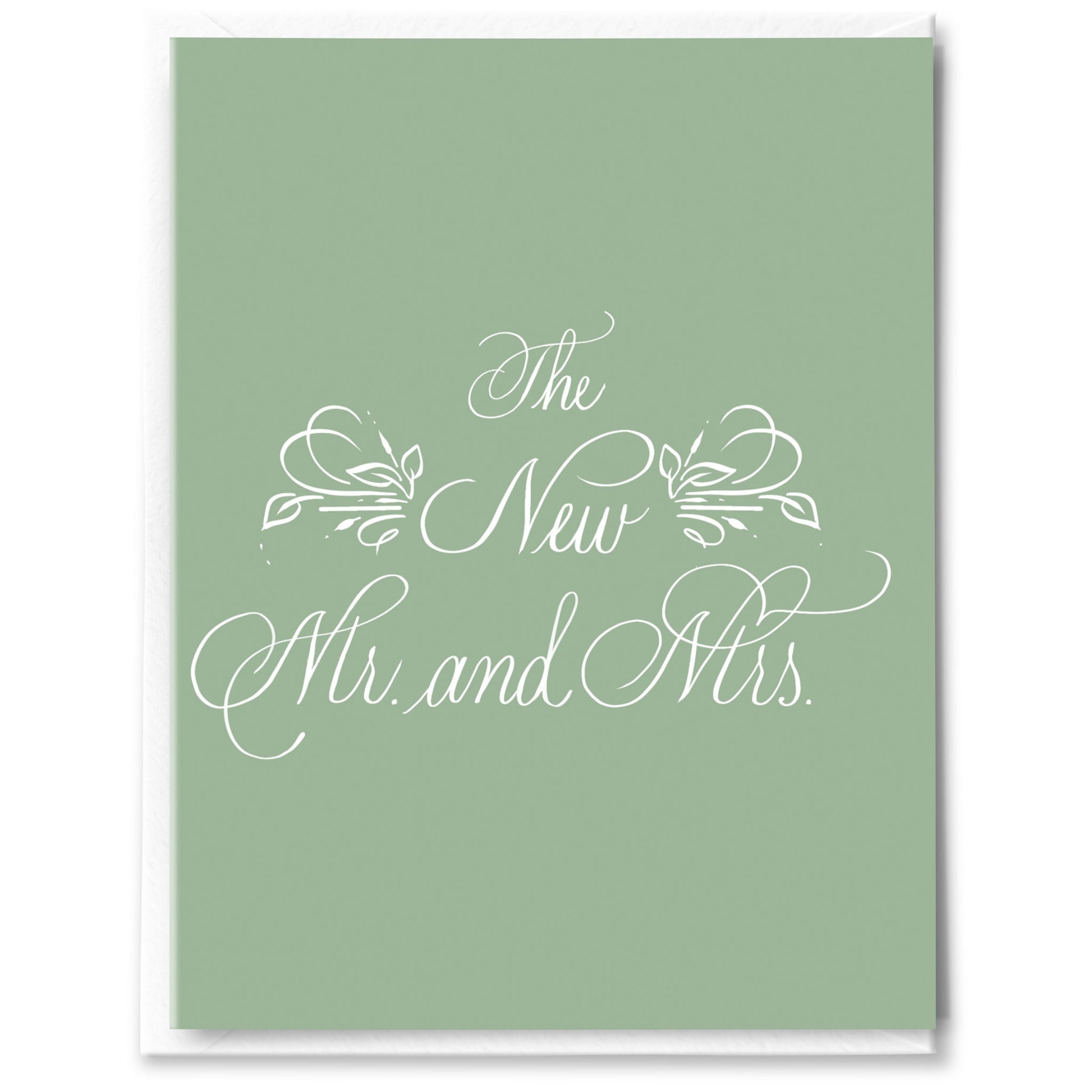 Hand-drawn in copperplate calligraphy, this sage green card will be a hit with the newly minted Mr. and Mrs.